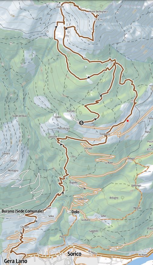 THIS TOUR CAN BE TACKLED WITH PEDAL-ASSISTED MOUNTAIN BIKES WITHOUT THE AID OF SHUTTLES, PEDALLING THE ENTIRE CLIMB FROM GERA LARIO. THE PORTAGE TO THE SUMMIT OF MONTE BERLINGHERA CAN BE AVOIDED BY TAKING THE VIKING TRAIL DIRECTLY. IN THIS CASE, THE POSITIVE AND NEGATIVE HEIGHT DIFFERENCE WILL BE 1450 M.