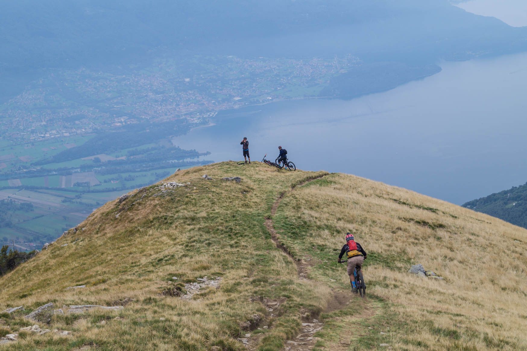 From here our portage begins. After about fifteen minutes of shouldering our bike, we soon arrive at Bocchetta di Chiaro at 1666m, a beautiful panoramic terrace between Valchiavenna and Alto Lario.