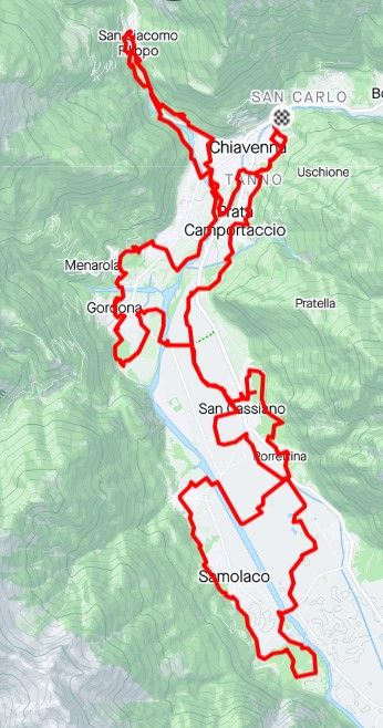 Partenza dal centro di Chiavenna, si risale una parte della Val San Giacomo lungo la famosa "Via Spluga" e si continua percorrendo i vari borghi e paesini della Bassa Valchiavenna passando da Mese, Gordona e le varie frazioni del comune di Samolaco e San Cassiano.